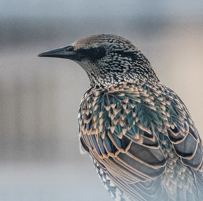 Unlike us, starlings can see in UV, and the ‘drabber’ plumage is the breeding plumage because those light feather-tips of early winter hide the iridescence that attracts a mate. But it’s complicated; according to Bennett et al (1997) “it is low UV and green reflectance, in combination with high violet and red wavelengths, that females prefer. “