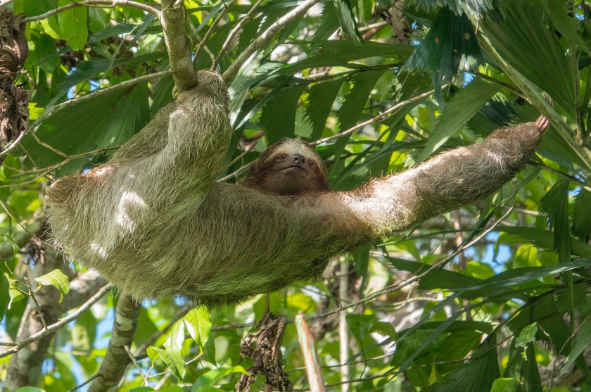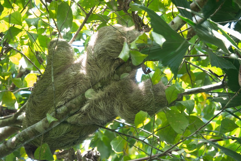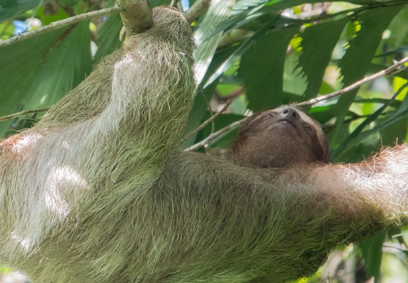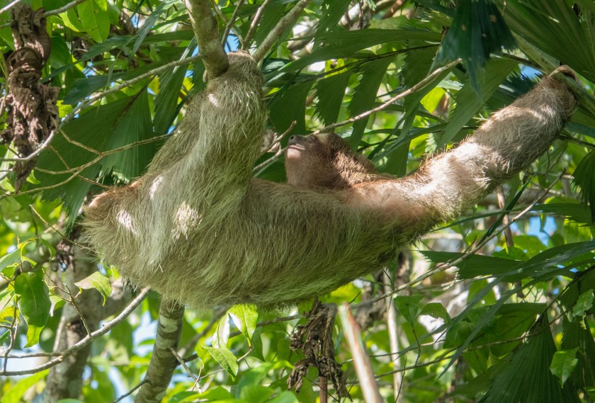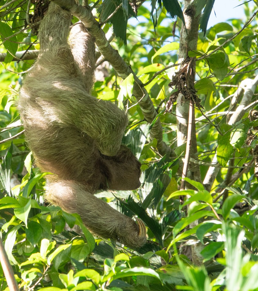 Costa Rica has three species of sloth, one of which is very rare. They live in the lush rainforest and are arboreal, often high up, which makes them hard to see and photograph, but on the other hand they don’t move much! This post focuses on the Three-toed Sloth, more properly called a Three-Fingered Sloth, which has three toes on all four limbs; here it is moving painstakingly about a foot along a branch. (The bottom is to the left, and the head is in the centre!!)