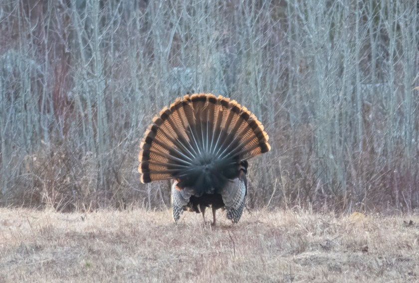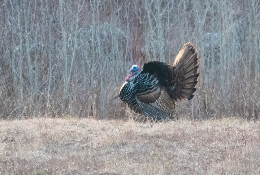 Very occasionally one emerges from the woods at dusk in full view when I have my camera handy. This was in August, after the field had been mowed, perhaps stirring up small prey animals.