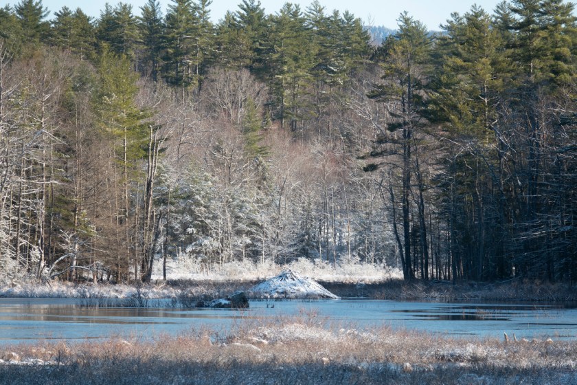 Seven minutes later it had run nearly 1/4 mile down the pond, stopping occasionally, and disappeared at the base of a beaver lodge. (It had started close to the lodge in the distance in the photo below, and ended up at the much closer lodge on the right.)
