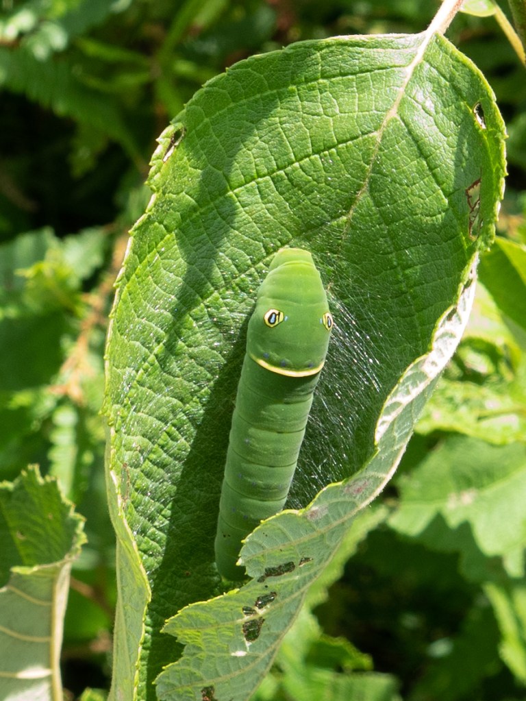 In a previous incarnation, it was a large green caterpillar, with fake “eye” markings to deceive predators; the actual head is the reddish section to the extreme left: