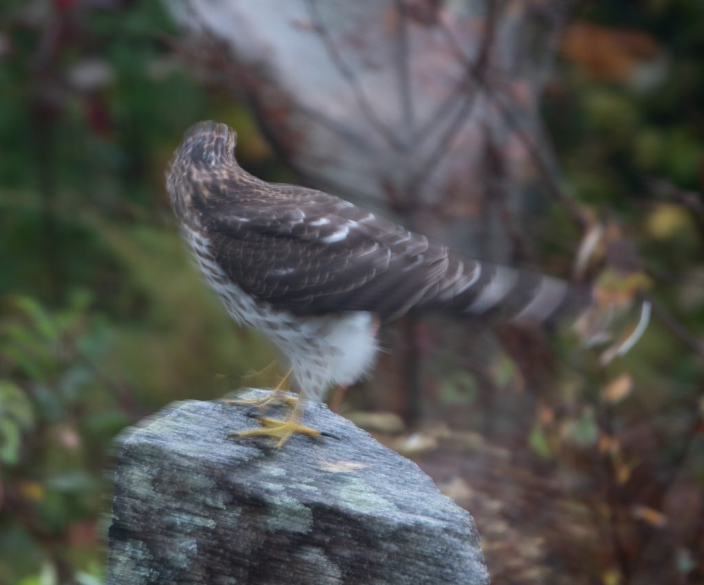 It has been a good few days for hawks around here. Soon they will fly south, but not quite yet. This is a juvenile Cooper’s Hawk, grooming itself after rain on top of an old beaver’s lodge in the middle of my wetlands: