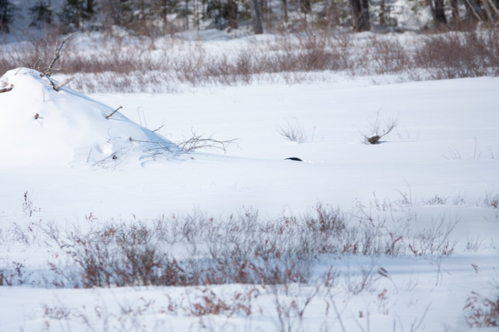 I thought I was done with otters, but no. Three weeks after my previous encounters, I saw him again. My first glimpse was a small movement of a tiny dark sliver of its head behind a snowbank, near the same air hole it had used before. Pure luck that I was looking in that direction. The top of the head is more or less in the centre of the photo below: