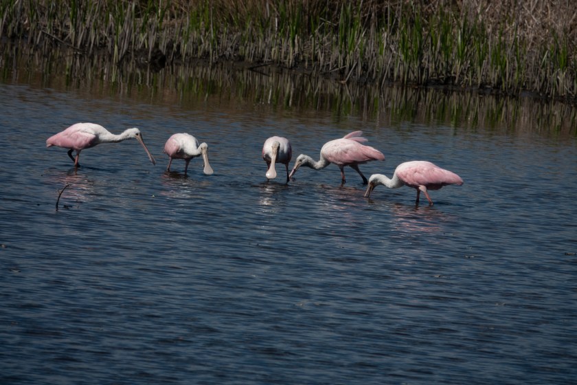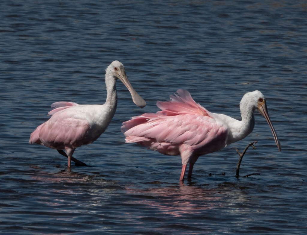 Roseate spoonbills, Platalea ajaja, are an ill-assorted mixture of delicate beauty and clumsy absurdity. Their elegant feathers shade from white through shell-pink to coral, but their comically oversized bills are spatula-shaped with rounded ends. They are a New World species, and I have seen them once before, in the Pantanal in Brazil. In the USA, they are limited to coastal areas in Florida and Texas