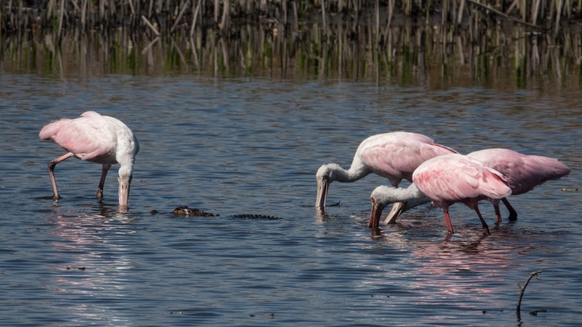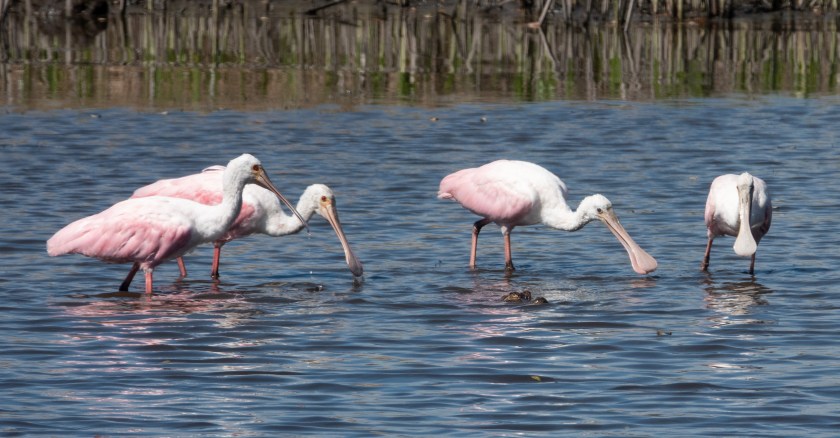 Fascinating blog, yet, again. Alligator gets some gold stars, for being so nice. The spoon bills have some rather large and beautiful wing feathers. They become nearly bald early in age…females, too? Spoonbills were my favorite bird, when I was little, playing Bird Lotto. You’re among all the wildlife action, Moira.
