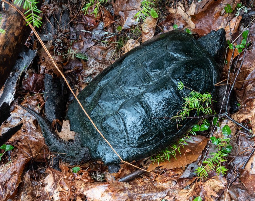 Snapping turtles, Chelydra serpentina, are ugly brutes, and not to be messed with. I’ve never had good enough photos before to do a post about them, but now I have. One was crossing the road near my house this morning, and two nice people had stopped to help it cross, and prevent any cars from running it over. When it made it into the woods, I got my camera.