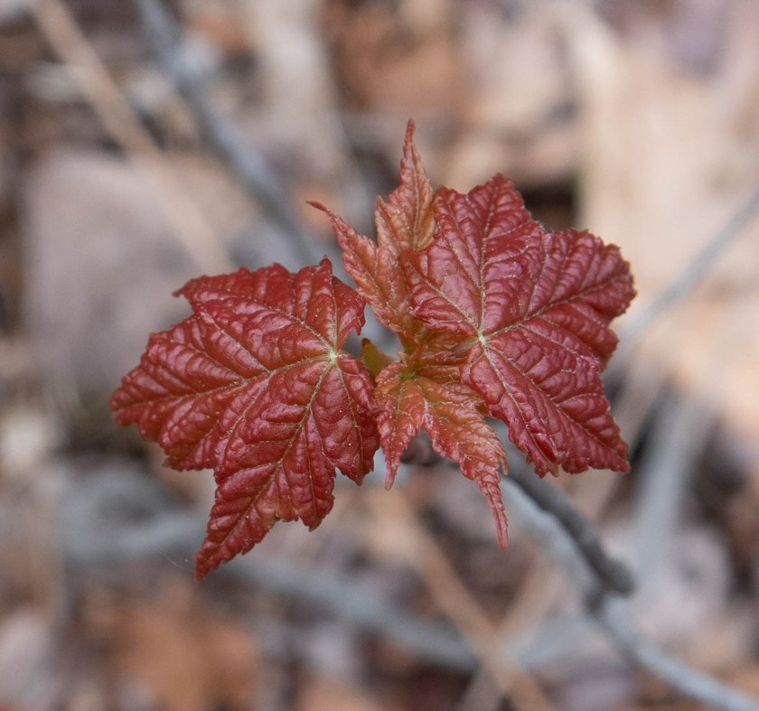 *A little more science. The chemical that makes the leaves red (in fall or spring) is called Anthocyanin, and the tree uses energy to produce it, so it must serve some beneficial purpose. It seems to be more common in young trees than in mature ones, and in poor soils. It may protect somewhat against drought, and late frosts. One theory was that it acted as a sunscreen, but recent work has debunked that idea, leaving the insect-deterrent effect as the leading contender for now.