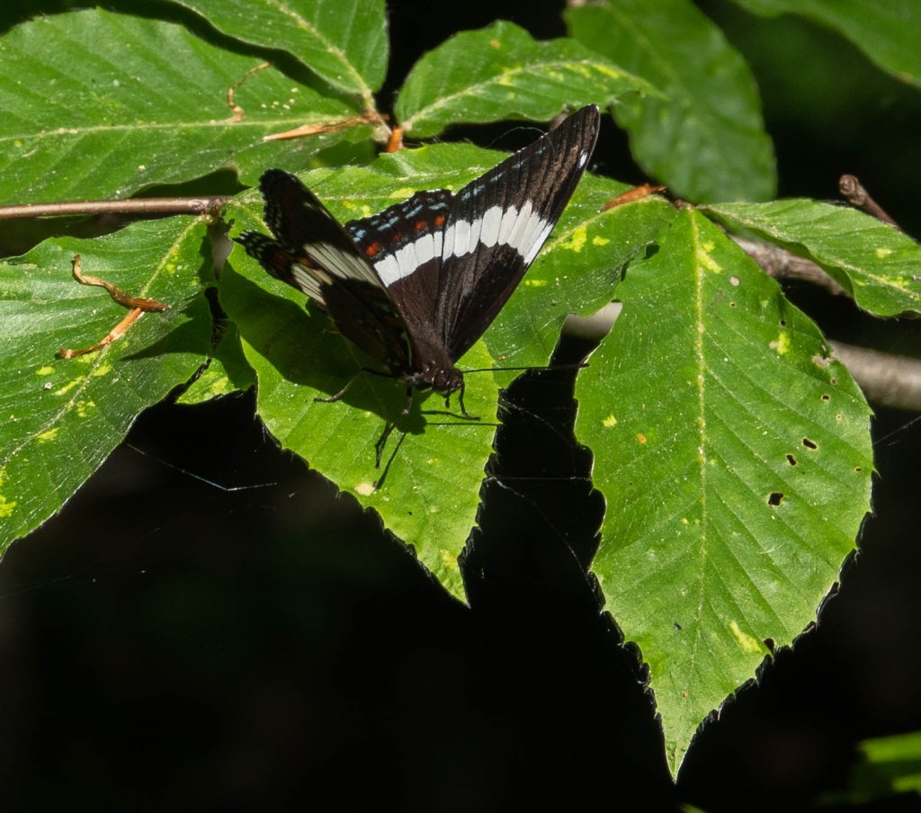 This is a White Admiral, Limenitis arthemis arthemis. Notice the red spots and the blue scalloped border. But go a little further south, and it becomes the Red-spotted Purple, Limenitis arthemis astanyax, totally lacking the broad white wing bands.(photo from Wikipedia)