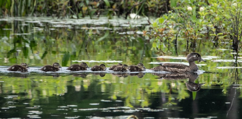 From hatching to flying is about 60 days, so the oldest batch can just about fly now, July 14th. But breeding season is not over! Yesterday, I saw a mother with seven brand new ducklings, each about 5″ long.