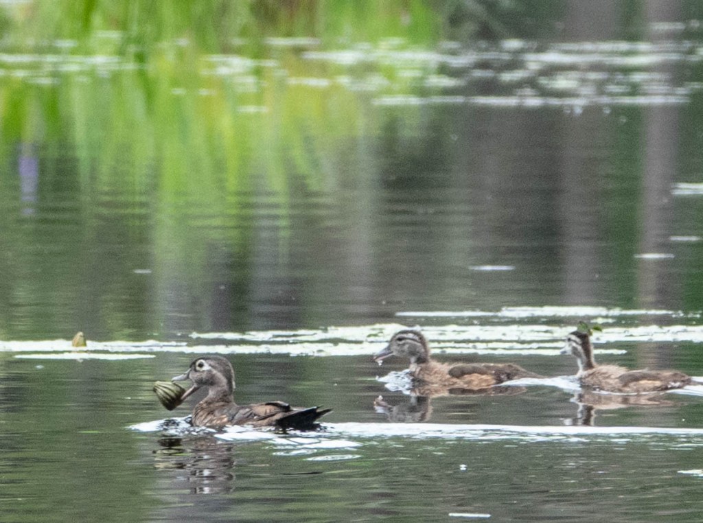 Wood ducks start nesting in mid-April. Incubation is 28-37 days, meaning the first ducklings arrive from mid-May onwards, and I saw two different sets of ducklings this year on June 2, one lot freshly hatched and one lot older. They are elusive, but I see them from time to time, rather surprisingly often eating spatterdock, which seems to be a favorite food*. Here’s one on June 19th:
