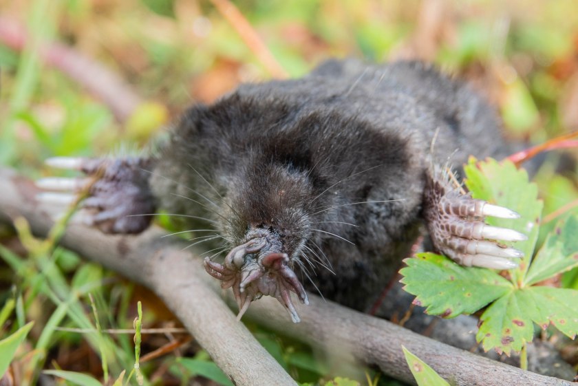 When I was reading up for this post, I discovered to my astonishment that they are very strong swimmers. “My” mole was close to a marshy area and a stream, and apparently this is typical. Although they live on land, many of their burrows end at the water’s edge, and they eat not only earthworms but also aquatic imvetrbertaes. I would give a lot to see one swimming. They use that nose in the water to to sense their surroundings. This wonderful short video shows them foraging both underground and in the water.