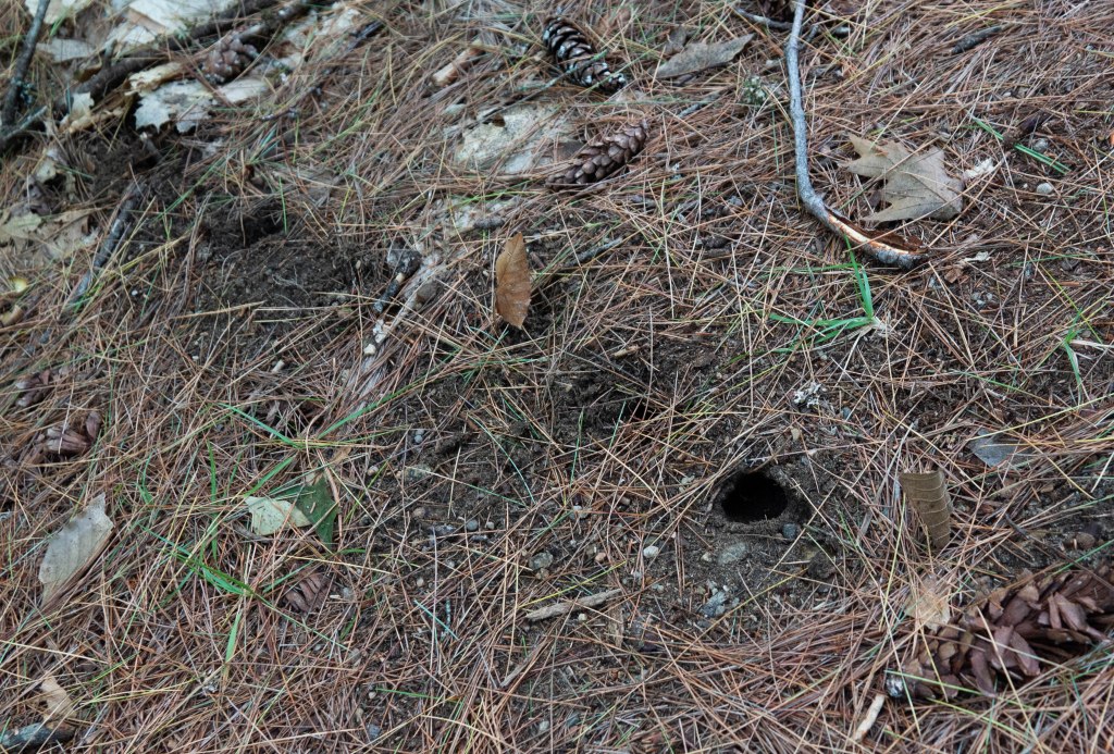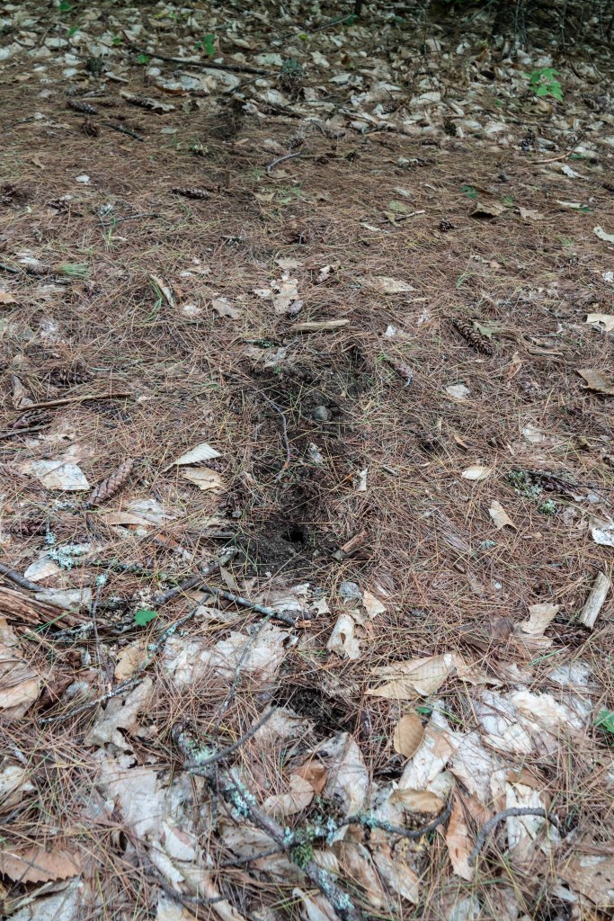 They tunnel underground, deep down in winter but close to the surface in summer, where the earthworms are. The tunnel pushes up the ground, as you can see in this photo, where the tunnel goes from top to bottom of the picture, across a human trail.