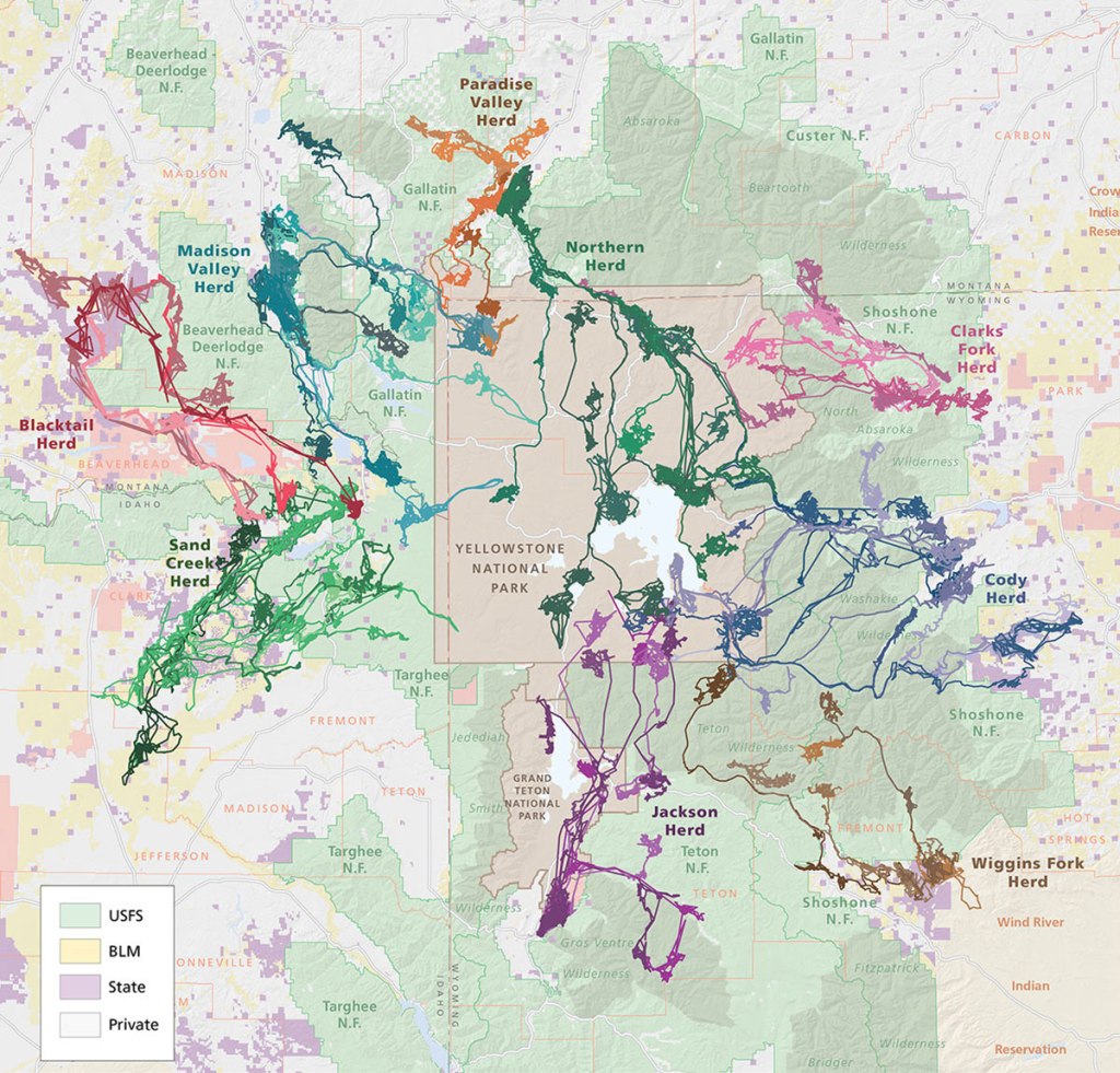Traditionally, the Jackson herd of about 11,000 animals would have moved from the Grand Tetons to lower elevations further south. Now their way is blocked by the town of Jackson at the southern end of the valley, so to prevent winter starvation the National Elk Refuge was created over 100 years ago, in 1912. Controversially, they are given supplemental food during the winter. The migration routes for the Greater Yellowstone elk herds can be seen below: the largest magenta blob, bottom center, is the Refuge.