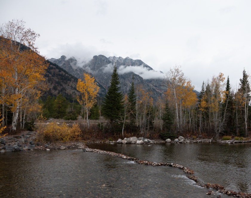 The drive from Lovell, Maine to Jackson, Wyoming is just under 2500 miles, and beaver live in both places. I didn’t actually see any in Wyoming, but we found fascinating evidence of their presence. New to me was a little dam made of pebbles only, just enough to create the sort of terracing effect that makes the stream deep enough to float logs down.