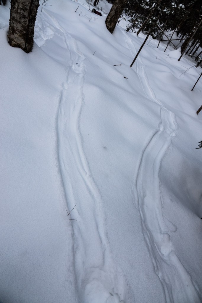 Then they peeled off into the woods, heading who knows where? The tracks were roughly parallel, about 7″ wide, but sometimes they’d part to go on opposite sides of a tree, then rejoin each other:
