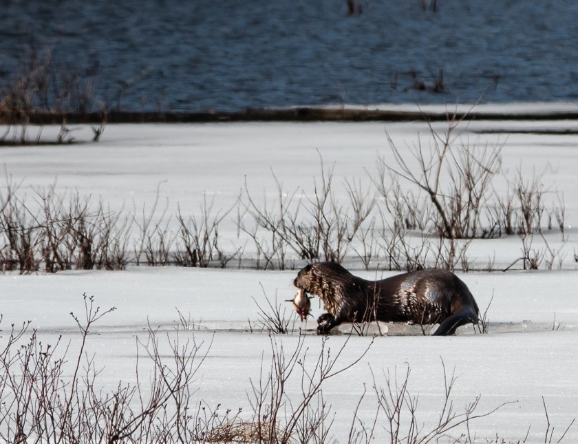 Otters are carnivores, and they eat fish, crustaceans, and from time to time small reptiles, mammals or birds. This one caught a good sized fish, probably a sucker, which is the preferred prey because they are slow moving and take less energy to catch.