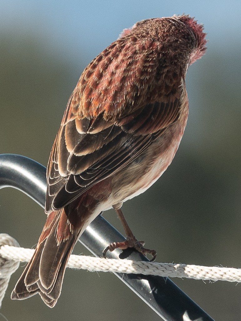 Today I’ll show you two rather similar red and brown birds that you might call “Town Finch and Country Finch”, after Aesop. The town finch, which I see in Boston, is the House Finch , Haemorhous mexicanus. Here is a male: