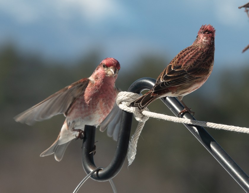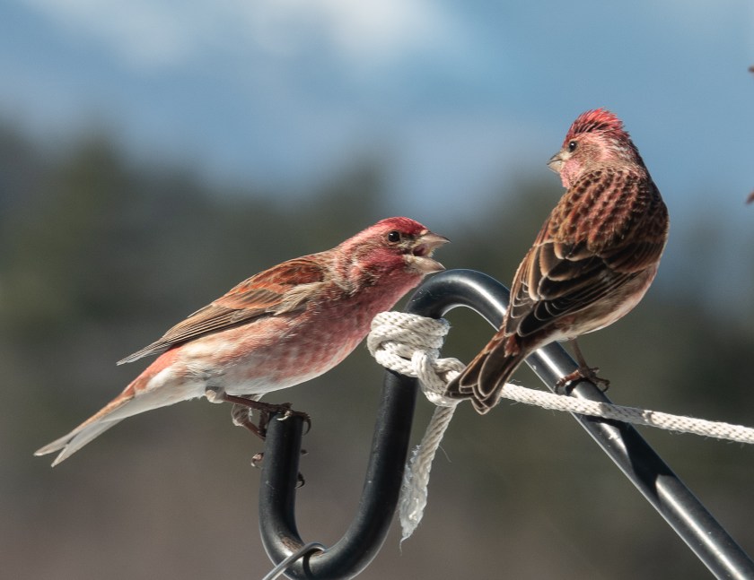 1. Love the photo of the finch on the rope with it’s crest up. If you miss your otters, you are fortunate to be able to go see the harbor seals in their outdoor habitat at the Aquarium. When finches come to our feeder to eat, they are always together.