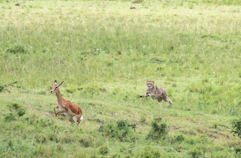 This was smart: this impala was pregnant, and a fraction slower than the other one. The cheetah is astonishingly fast: