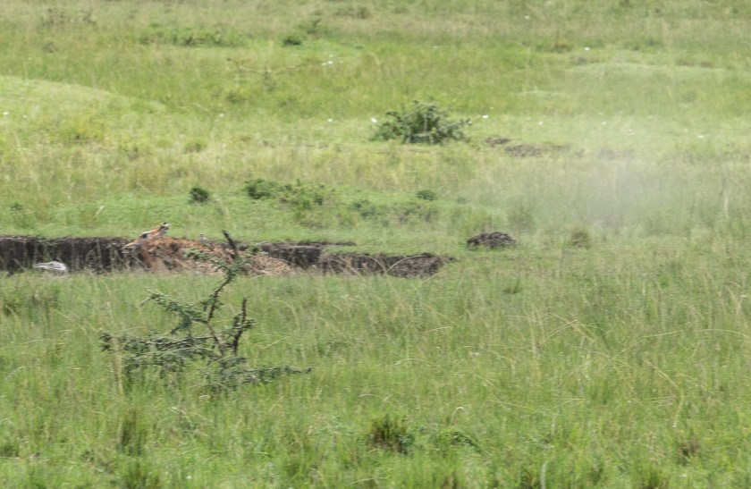 The impala sought refuge in a gully: big mistake. This blurry photo shows the moment the cheetah caught her, grabbing her by the throat. The impala is on the left, the cheetah on the right.