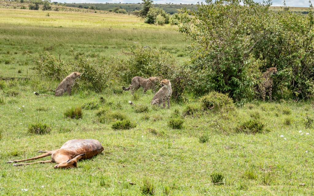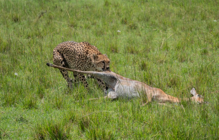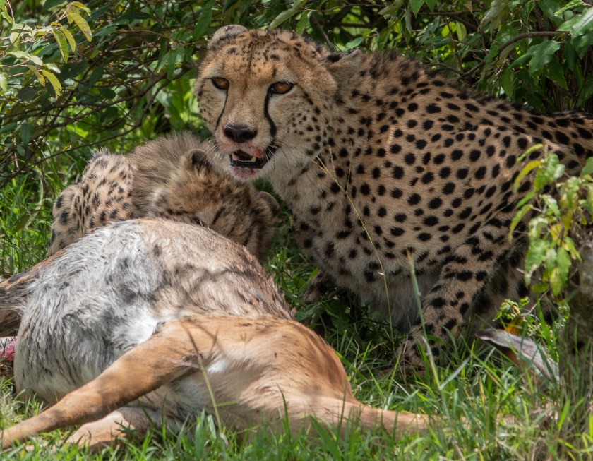 the proud cheetah focussed on getting it under cover so vultures, jackals, and leopards couldn’t find it. Dragging was hard work, as you can see: