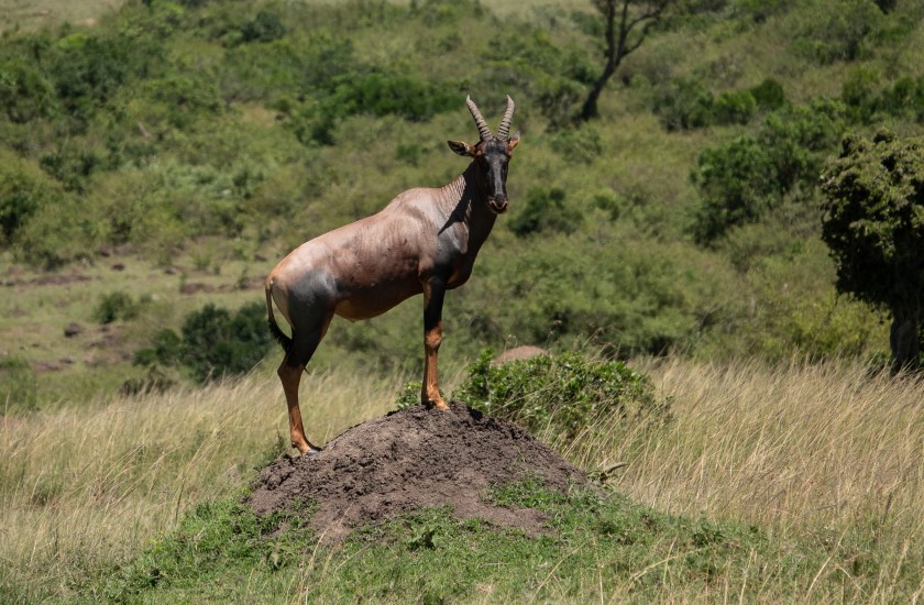 The previous evening they had been seen hunting and killing a young topi. Topi adults are good-sized antelope, 90-150Kg, much too big for the cheetah to tackle. Rather charmingly, the males are prone to standing with their forefeet on termite mounds to improve the view: