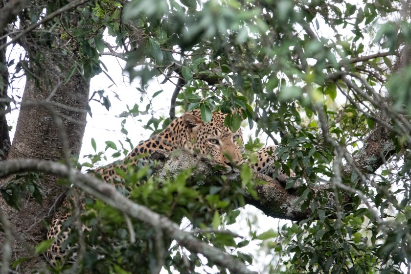 The leopard was nowhere to be seen, probably sleeping nearby on the ground. So we came back at 4pm, and there he was, sleeping on a branch just below the carcase.