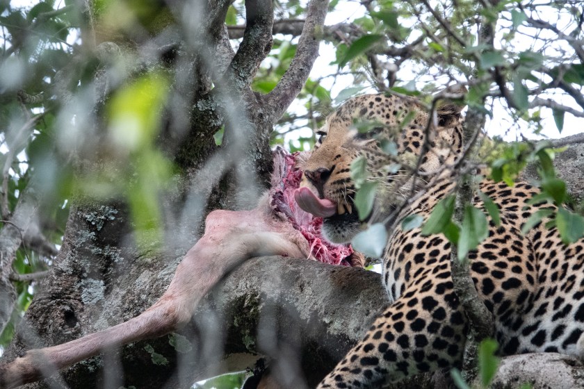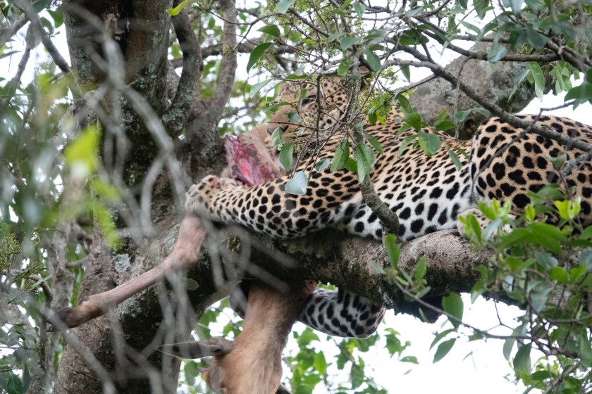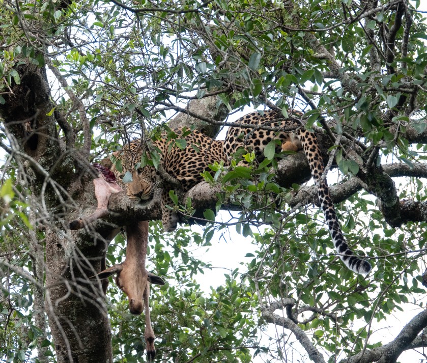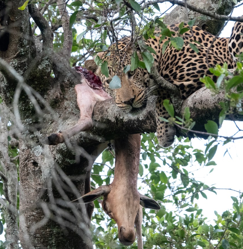 I saw none of this, but it was the talk of the camp that evening. So next morning we went looking, and there, up in a tree in distinctively leopard style, was the ex-topi.