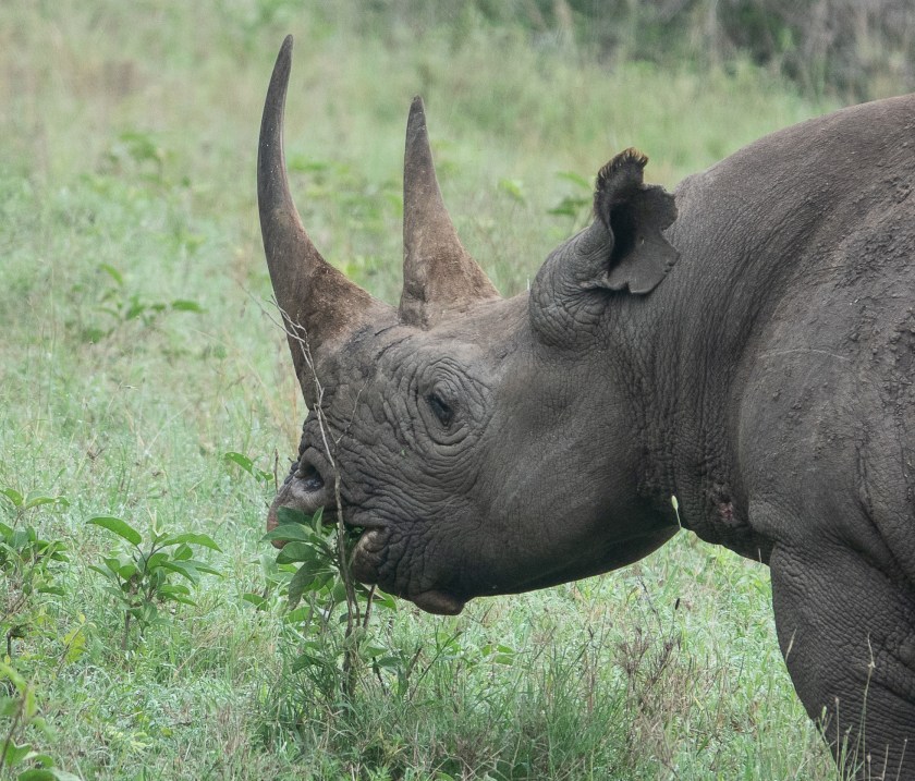 I have seen black rhino, Diceros bicornis, once before, in Namibia, but their horns had been clipped off to protect them from poaching. In Kenya, though, I saw them in their untampered and intimidating state. I saw them in Lewa Downs in Laikipia, and also in Nairobi National Park, both of which have excellent anti-poaching programs, and healthy populations of these enormous animals.