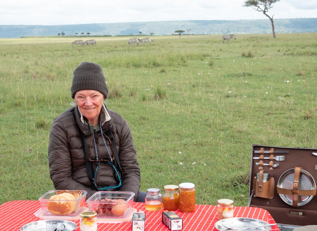 After a few hours of game watching in the Maasai Mara, we had paused for breakfast on a rise looking out over the huge grassy plain, filled with gazelle, impala, zebra and buffalo (this picture looks in the opposite direction, but I thought you’d like to see what breakfast was like!):