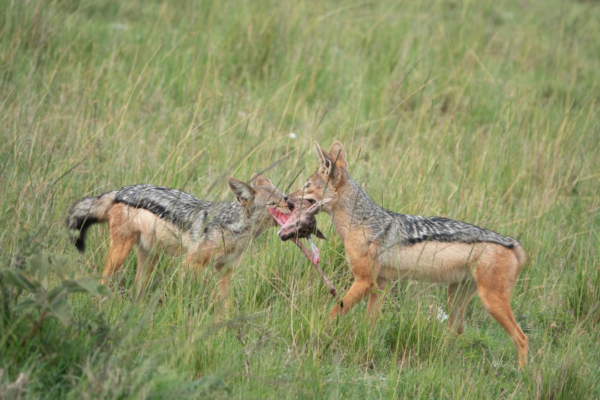Black-backed Jackals, I had always thought, are scavengers, feeding off the carcasses killed by lions.This one in Namibia is feeding on an oryx carcass (the jackal is immediately behind the carcass, and the oryx horns are in the left foreground).
