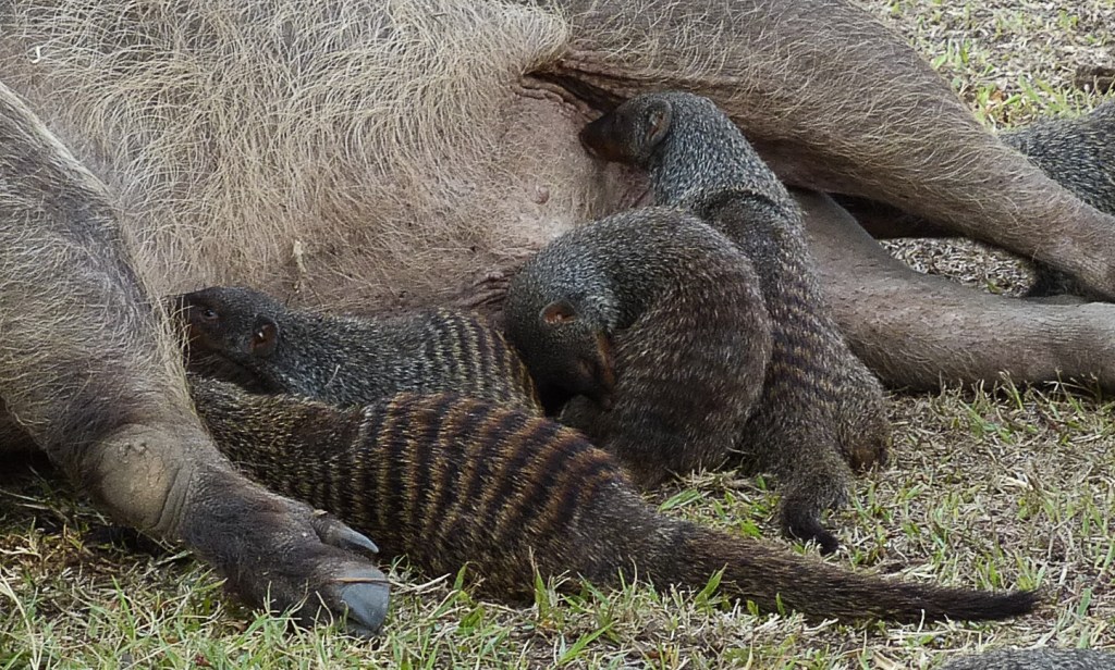 In Uganda a number of years ago there was a resident warthog at one of the lodges that had bonded with a family of striped mongoose.