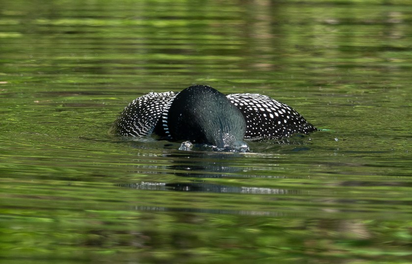 PS Around here there is an annual loon count, and also research projects that band the loons whenever possible. One of the adults was wearing brightly colored ankle jewellery, and it tells me this one is the female. Last year she was on the same pond with the same mate. This is not always the case: loons do not mate for life.