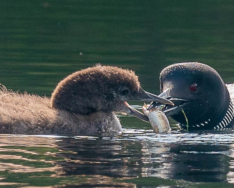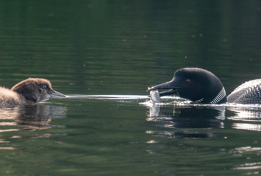 I have been taking my kayak to a nearby pond that is big enough for loons to inhabit. A pair are raising a single chick, and their solicitude is a joy to watch. They bring tiny fish: