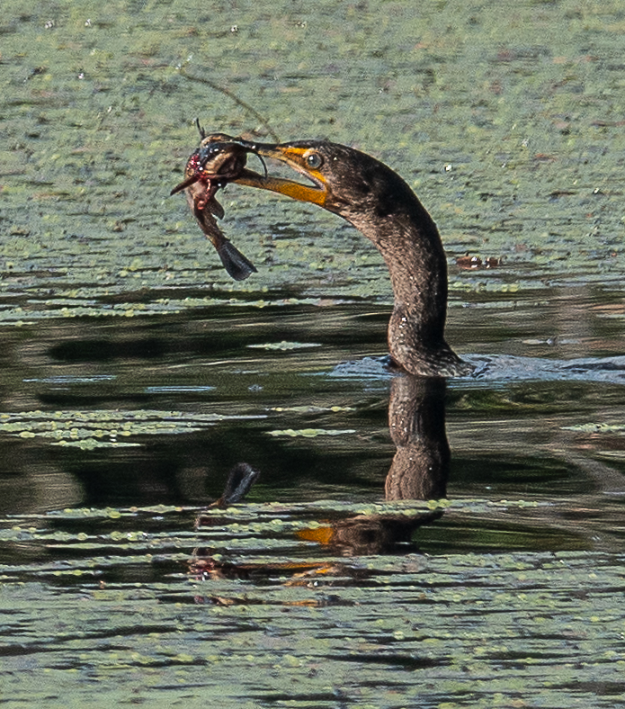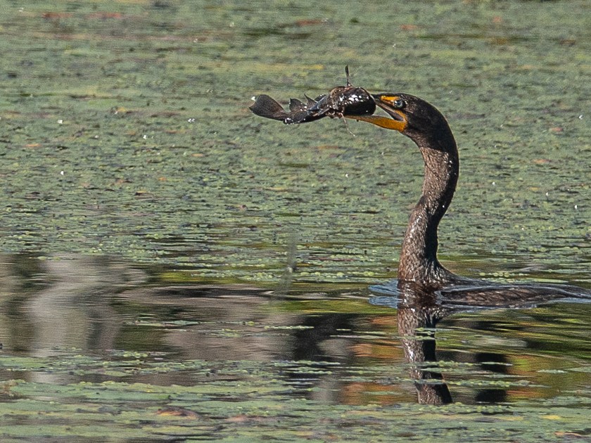 They come inland to a greater extent than most other cormorant species, and last week, for the first time, I had one on my beaver pond. And I photographed it just as it caught a pretty big fish, entangled in weeds:
