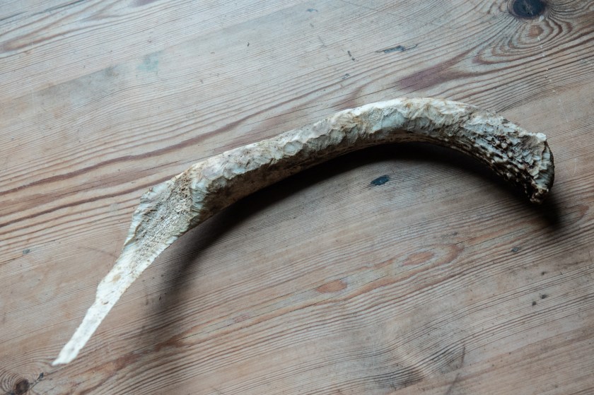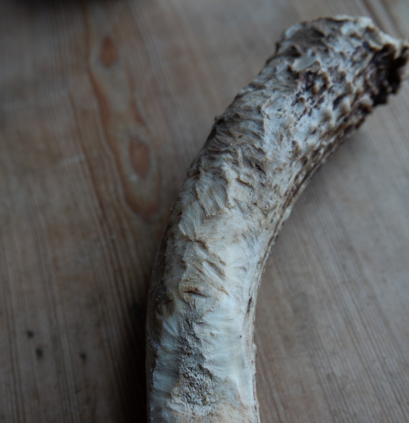 The size of the tooth marks is a clue to who has been eating the antler. In the picture above it was something small, squirrels or mice. If it has cracked right through to the inside, it is something bigger: