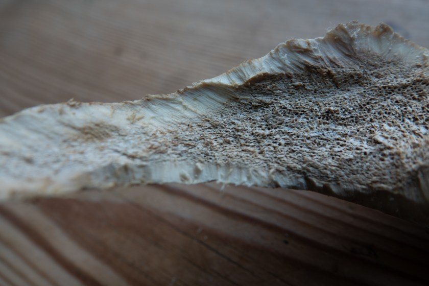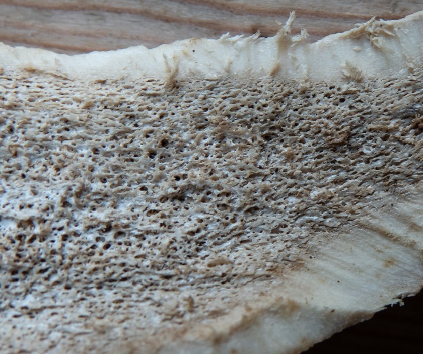 The interior is spongy bone, well supplied with blood vessels when the antlers were growing. For whatever reason, this doesn’t seem to get eaten much.