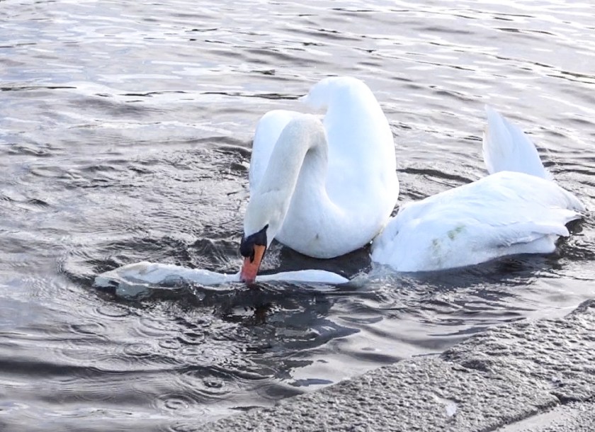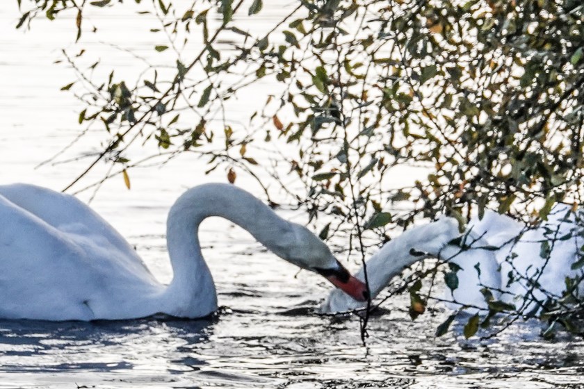 I walked on, and ten minutes later realized they had caught up with me and were still at it, close to the water’s edge. Once I got a good look, this was clearly not an amorous encounter. One swan was grabbing the other swan’s neck,