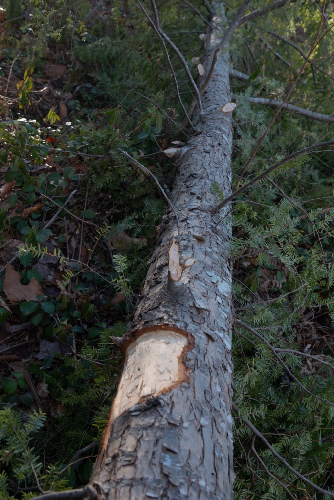 To add insult to injury he had also returned to the first hemlock, eaten some cambium from under the bark, and cut off some branches, but of course I had no camera there either.