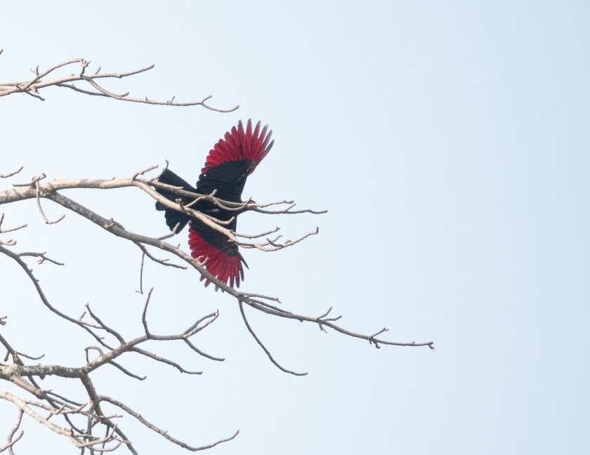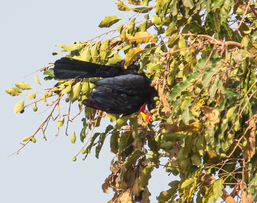 Sitting high in the tree was a plump purplish-black bird the size of a large pigeon with a long tail, a crimson head and a chunky reddish-orange bill: