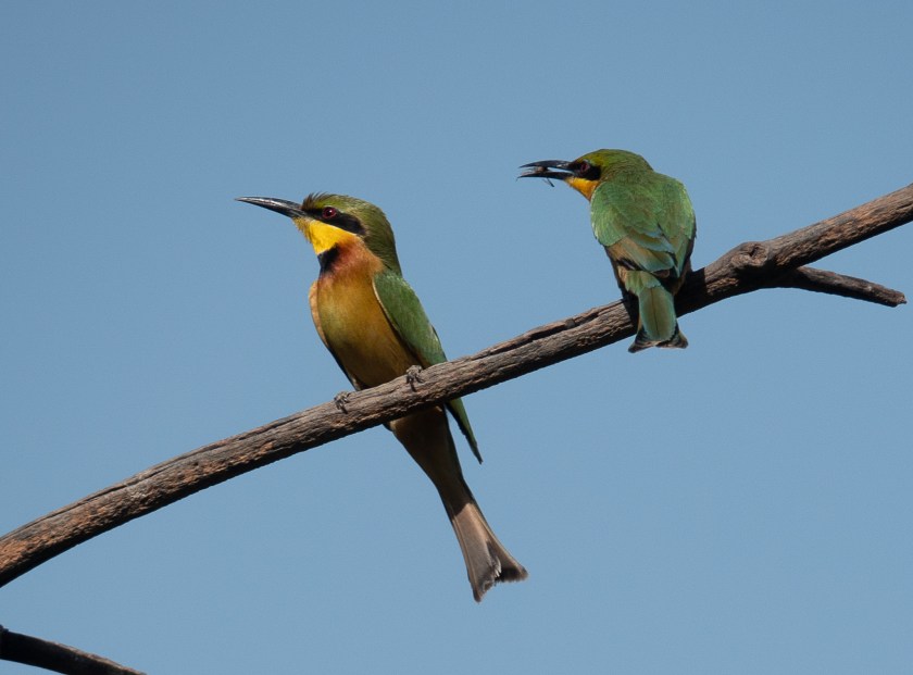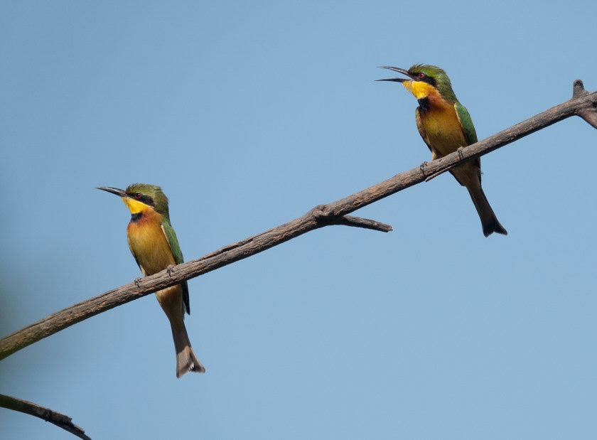 Found all over Africa, and not endangered, they are diminutive jewels, inclined to perch in the open and low down, making them a photographer’s gift. The orange and green coloring is surprisingly good camouflage. They are frequently in pairs, though these two don’t seem to be getting along too well: