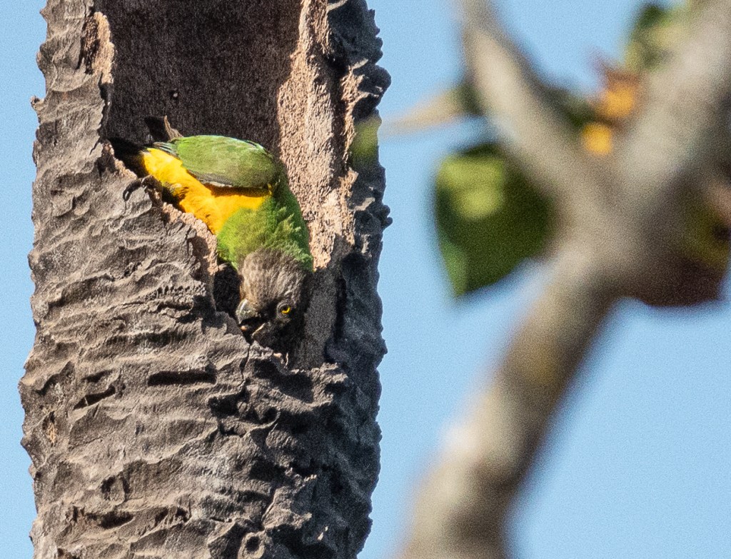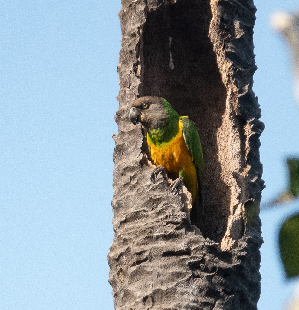 These Senegal Parrots, Poicephalus senegalus, are nesting in the trunk of a dead palm tree: