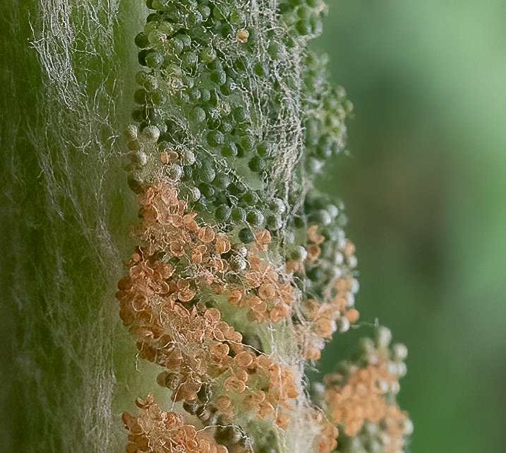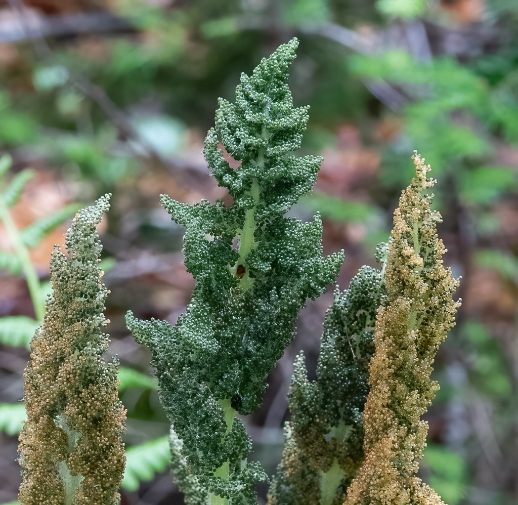 The fronds are covered in tiny globules called sporangia, within which the spores are gestating.