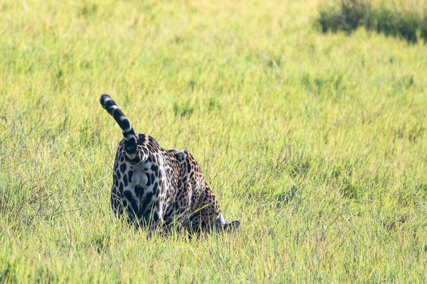 In the Northern Pantanal, jaguars tend to eat capybara, but in the Southern Pantanal, on these vast cattle ranches, the jaguars most certainly like to eat beef. Ten jaguars on a cattle ranch next door to the one we stayed on were monitored for 2 1/2 years between 2001-2004. The researchers counted their kills, which “were composed of 31.7% cattle (9.8% adults and 21.9% calves), 24.4% caiman (Caiman crocodilus yacare), 21.0% peccaries (mostly Tayassu pecari)”. No other species was above 5% of their diet.