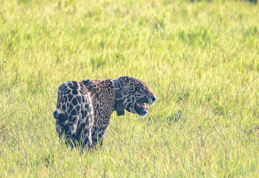 This diet has advantages to the jaguar (lots of juicy cows to eat), but it also poses a threat to their survival. Jaguars are classified by the IUCN as Near Threatened, mainly due to habitat loss and conflicts with cattle ranchers. The Wildlife Conservation Society estimates there are about 5000 left in the Pantanal, and maybe 10,000 in the Amazon.