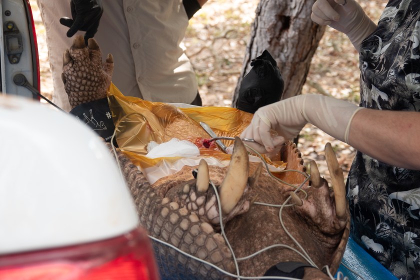 The veterinary team are masked and gloved, and then they prep for the implantation of a tiny transmitter under the skin of the armadillos belly. He is clearly a male!