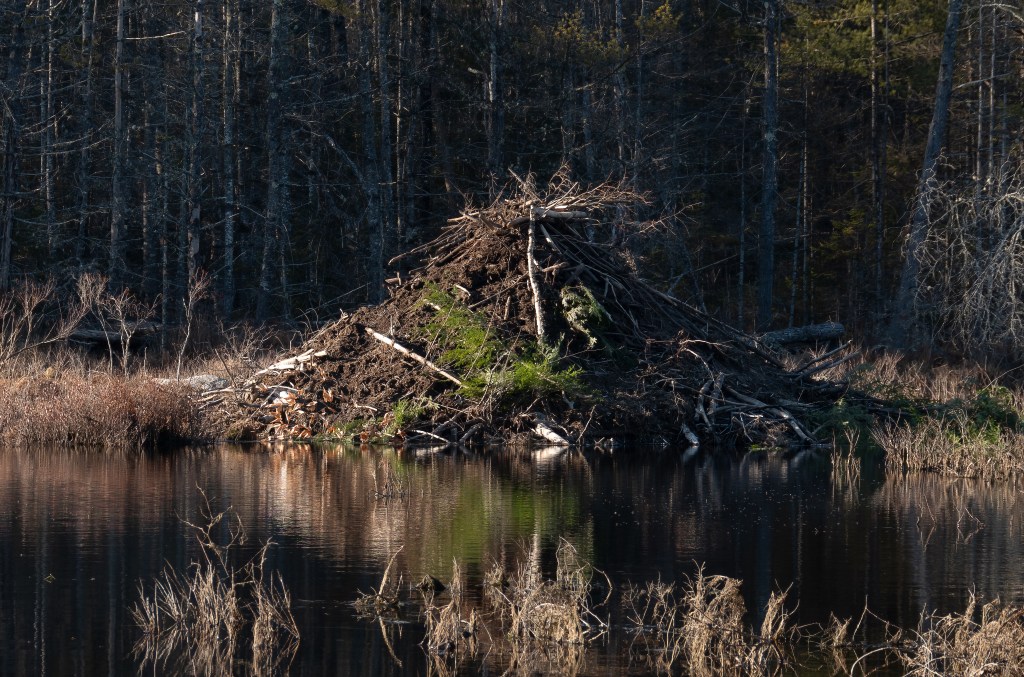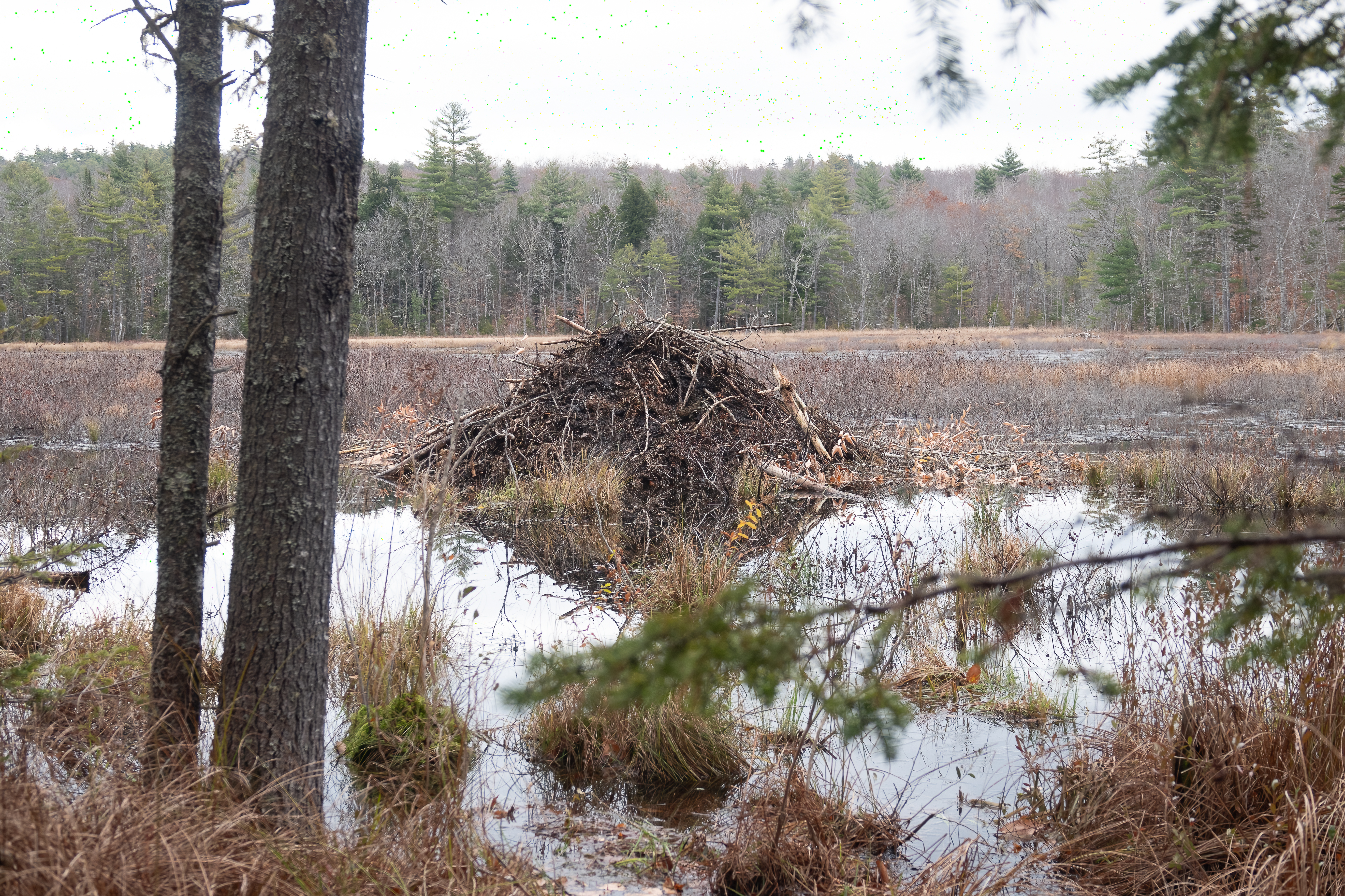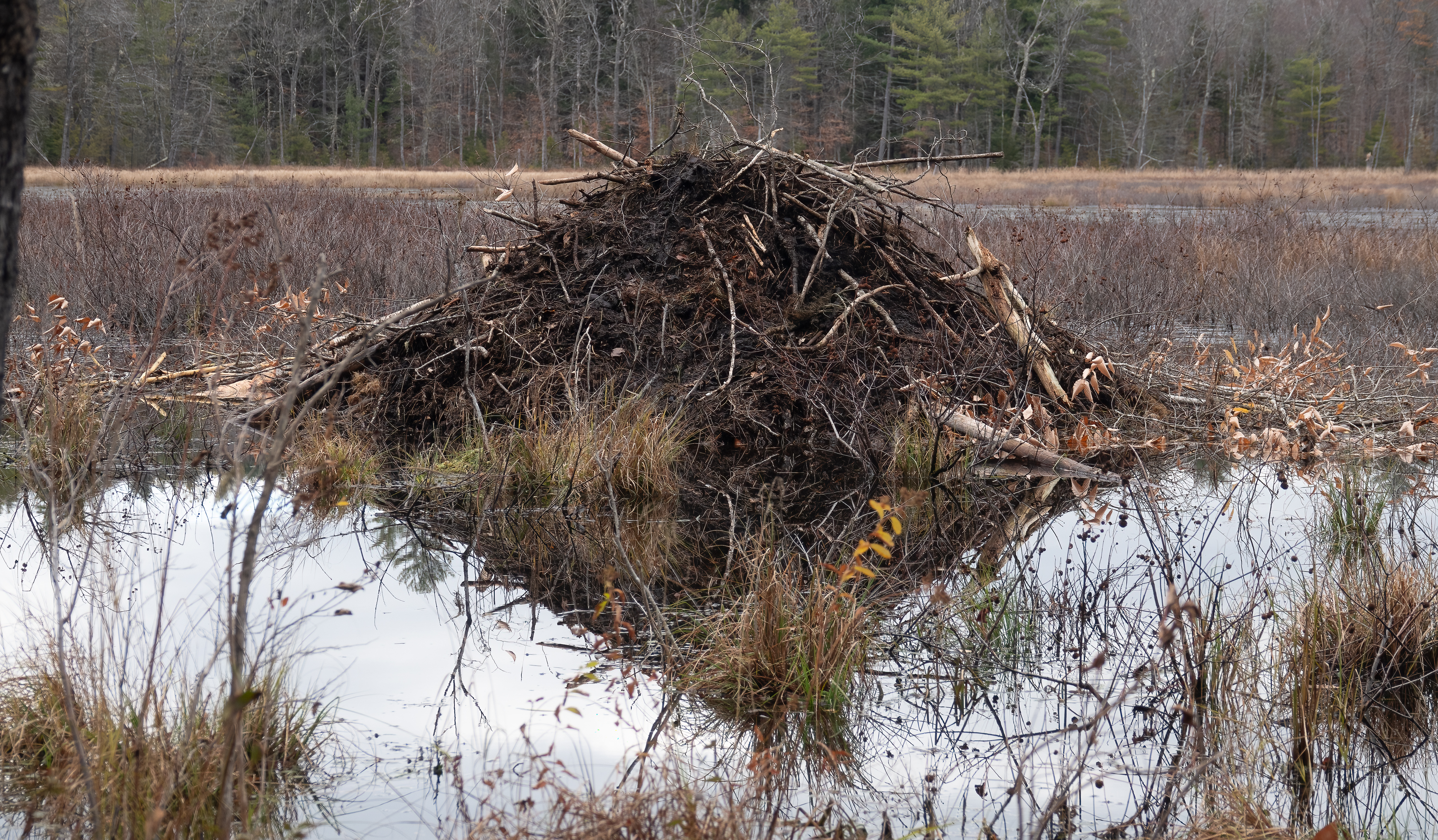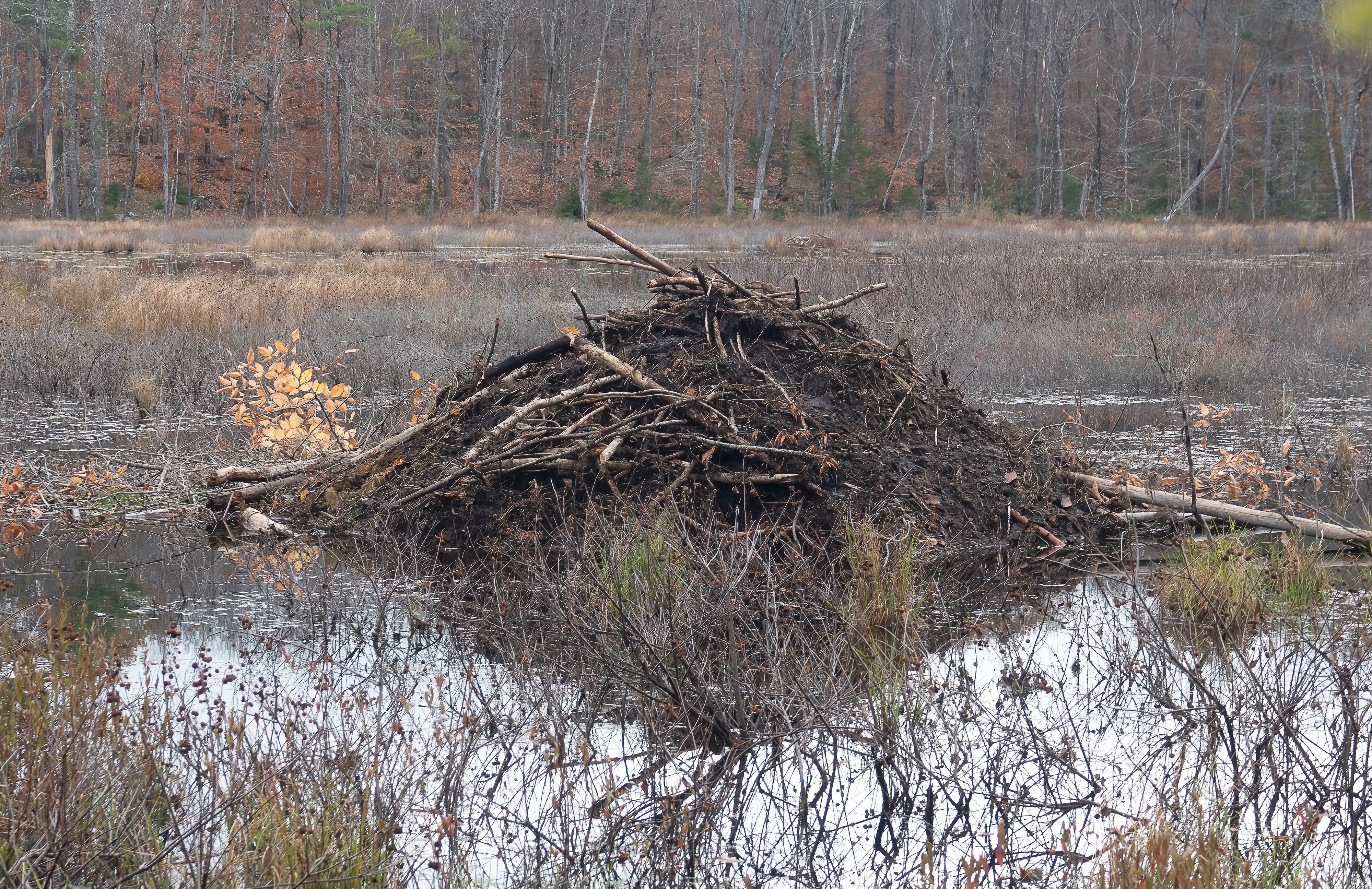 The beavers are definitely around, but playing hard to get. They have built a new lodge, inconveniently on the opposite shore of the pond, where I can only reach it when the stream’s water level is low enough to cross. These photos show it growing, from November 14 to December 17: