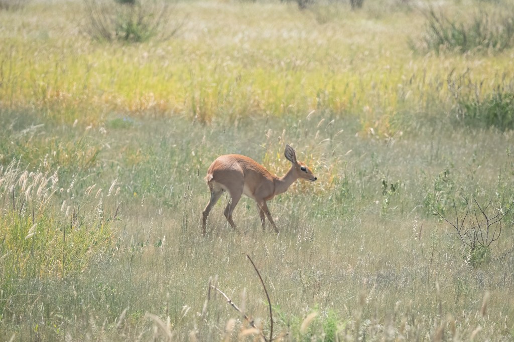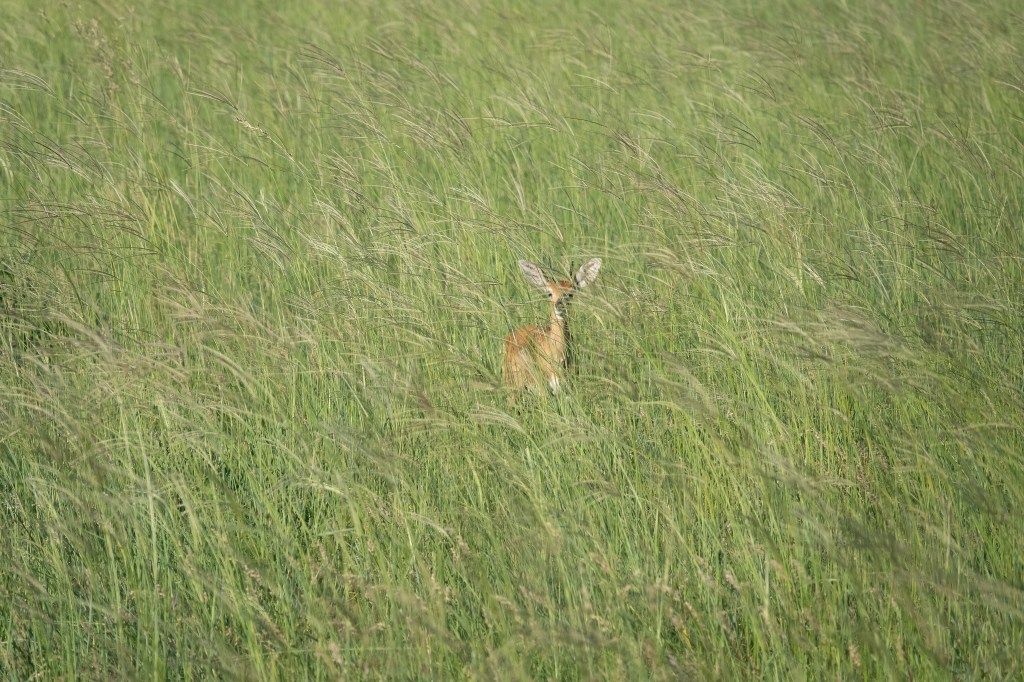 The Steenbok, Raphicerus campestris, is a miniature antelope, 24″ tall at the shoulder. The grasses that barely reached the giraffe’s knees rise over the steenbok’s head: