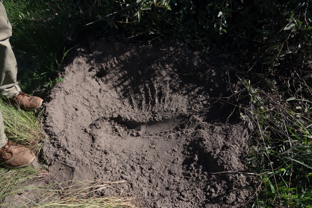 As the elephants move through the landscape, you sometimes find their bedrooms. They choose a small sloping bank, and scrape a depression in it. They lie so that their feet are lower than their head, making it easier to get up in the morning! In this shot, TJ is standing near the head rest area, the feet would be in the foreground.