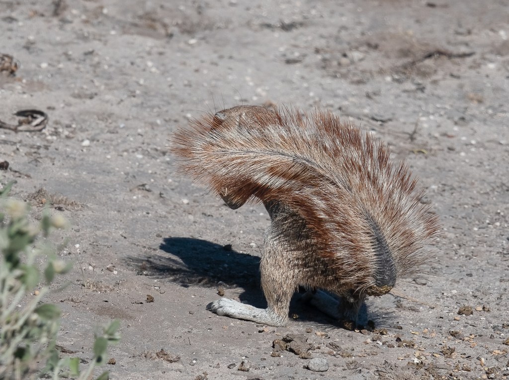 Smaller, and more nervous, the Cape Ground Squirrels, Geosciurus inauris, live in holes, and emerge to feed.The female in the movie below may be pregnant, her nipples are enlarged and she has a big belly: